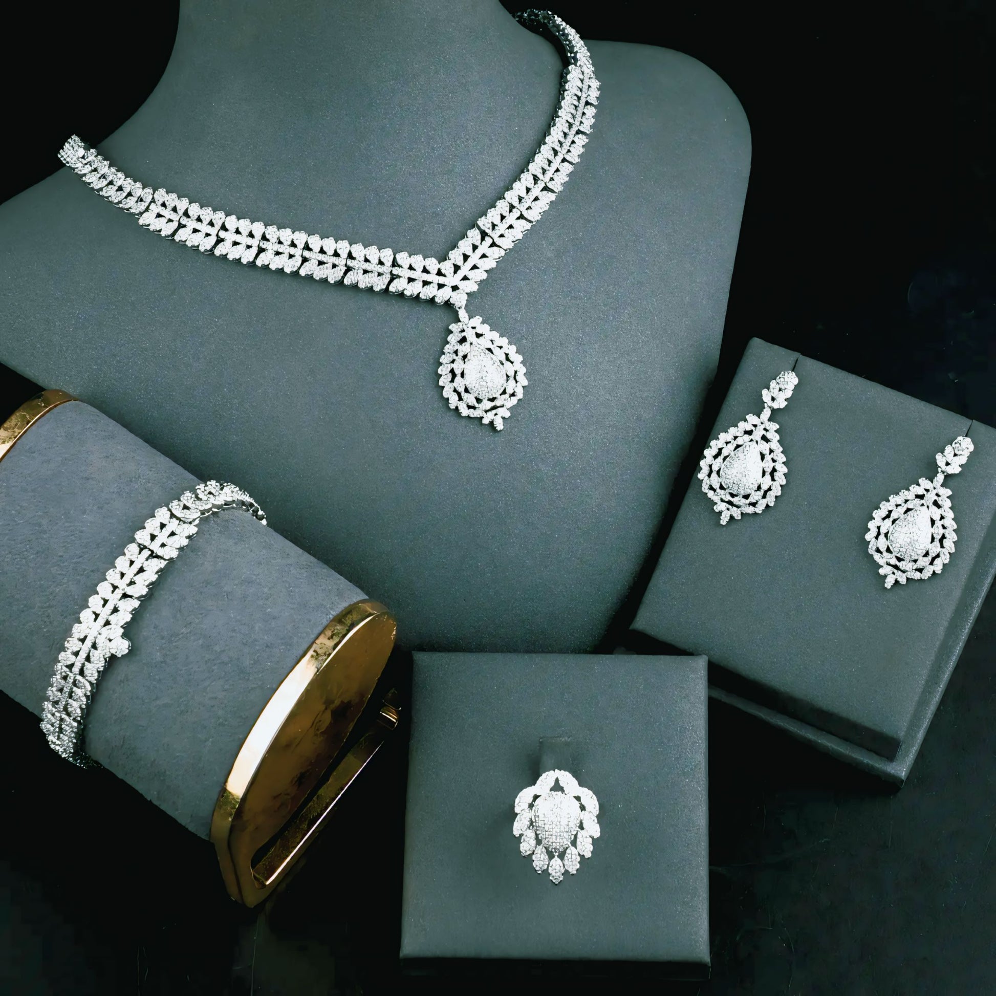 Elevate your bridal look with this Dubai Luxury Full Zircon Jewelry Set, crafted with premium 3A Zircon stones and elegant platinum plating. Designed with micro-insert inlay technology to ensure brilliance and durability, this set includes a necklace, earrings, bracelet, and adjustable ring – everything you need for weddings, anniversaries, and special occasions.